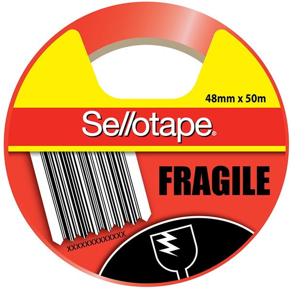 Sellotape Fragile tape is a highly visible orange packaging tape that alerts package handlers to handle fragile content with care
