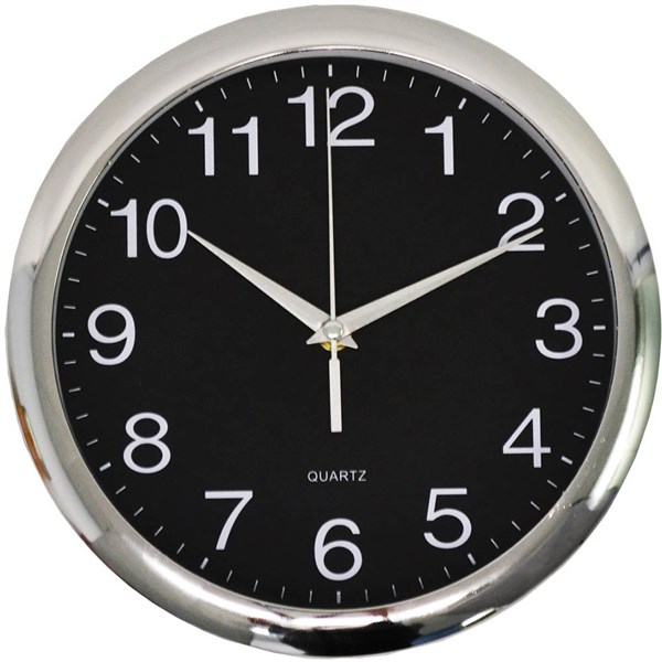 Tell the time with this modern 30cm wall mountable clock with black face and chrome trim