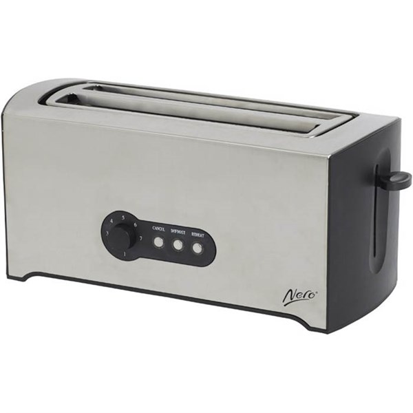 The stylish Nero 4 slice toaster has adjustable browning control, defrost, reheat and cancel settings and crumb tray