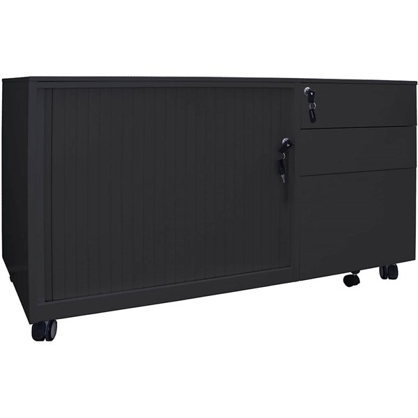 - The unit is fully lockable and has a Flush Front mobile pedestal and a Tambour door section with a centre shelf